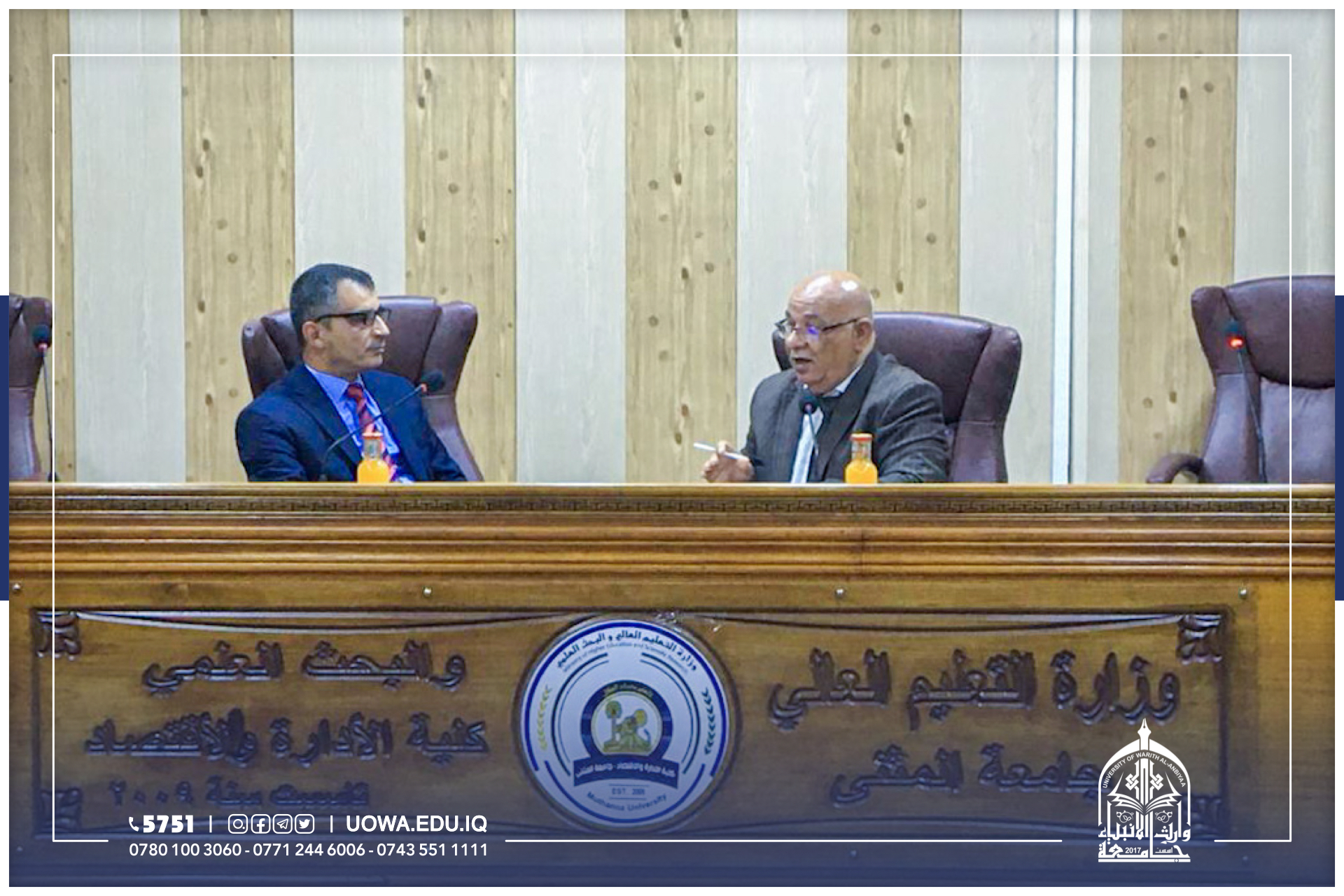 كلية الاارة والاقتصاد في جامعة وارث الانبياء جامعة المثنى وكان باستقبالهم الأستاذ المساعد الدكتور صفاء كريم عميد الكلية.