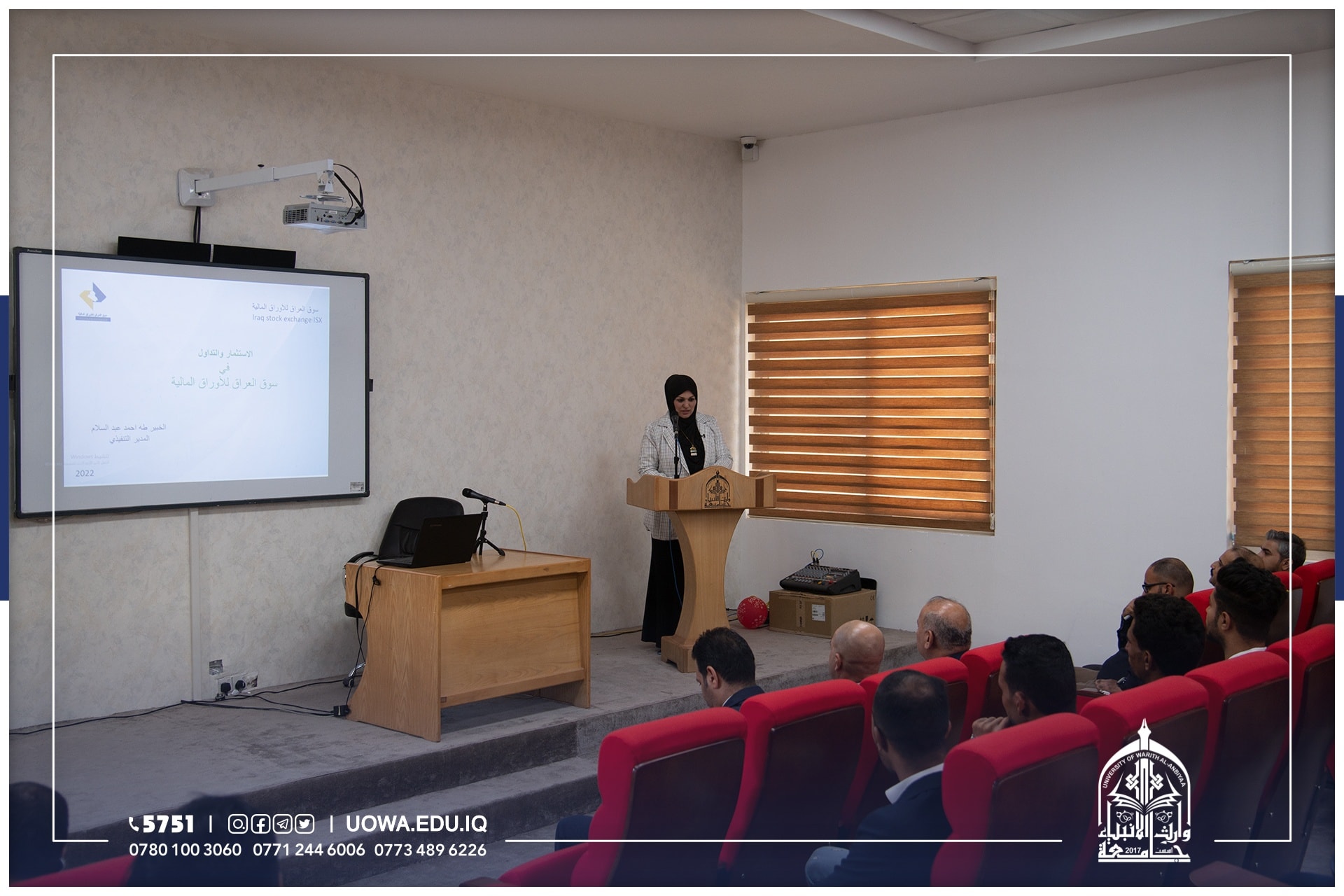 اقامت كلية الادارة والاقتصاد/قسم المحاسبة ندوة علمية بعنوان"سوق العراق للاوراق المالية" قدمها الخبير طه احمد عبد السلام المدير التنفيذي لسوق العراق للأوراق المالية.