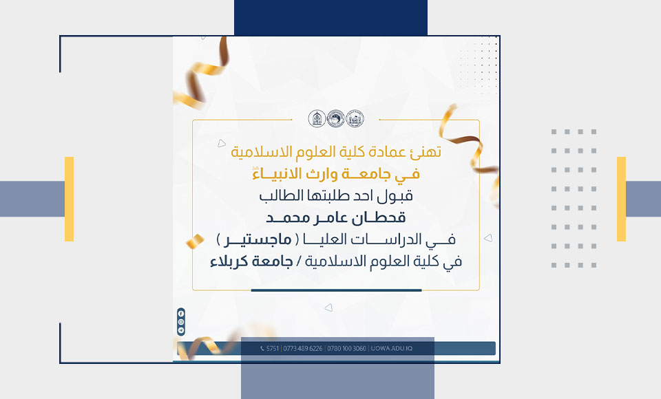 تهنئ عمادة كلية العلوم الإسلامية في جامعة وارث الأنبياء (عليه السلام) خريجيها الذين تم قبولهم في برامج الدراسات العليا (الماجستير في تخصص العلوم الإسلامية). نتمنى لهم التوفيق والنجاح في مشوارهم الأكاديمي المستقبلي.