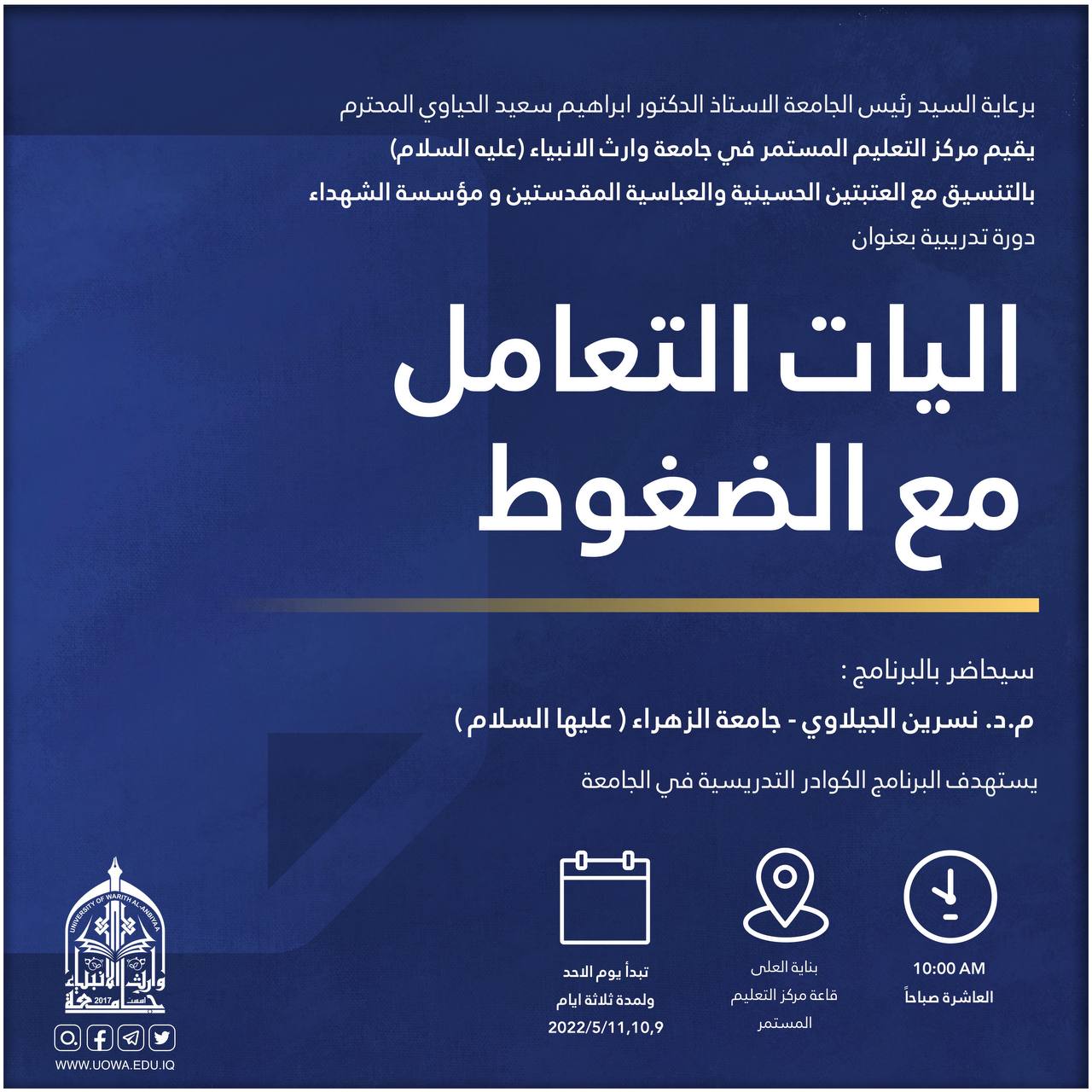 يقيم مركز التعليم المستمر في جامعة وارث الأنبياء (عليه السلام) وبالتعاون مع كلية العلوم الاسلامية دورة تدريبية بعنوان (التصحيح اللغوي في المخاطبات الرسمية) والتي تعقد ابتداءً من يوم السبت الموافق 21/5/ 2022 ولمدة ثلاثة أيام، يلقي الدورة حضورياً كل من: