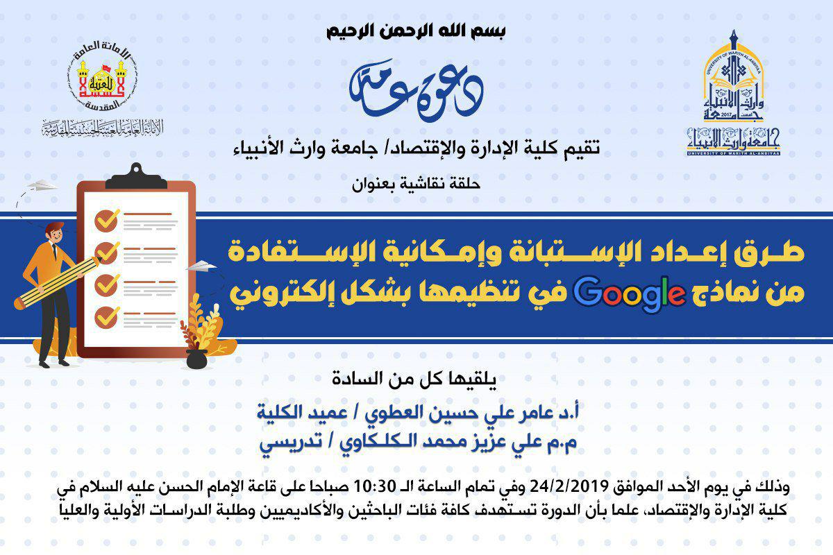 اقيمت في قاعة الامام الحسن -كلية الادارة والاقتصاد حلقة نقاشية بعنوان اعداد استمارة الاستبيان وكيفية استخدام نماذج Google في نشرها الكترونيا من قبل أ.د.عامر العطوي و م.م.علي عزيز وقد تضمنت الحلقة الاشارة الى العديد من المحاور المهمة التي تتعلق بمفهوم الاستبيان والية بناء الاستبيان والخطوات اللازم اتباعها من قبل باحثيين بالاضافة الى تقديم امثلة تطبيقية حول نماذج Google وقد شارك في الحلقة النقاشية المساعد العلمي لرئيس الجامعة أ.د.عباس الدعمي وتدريسي كلية الادارة والاقتصاد و عدد من تدريسي باقي الكليات وعدد من الطلبة