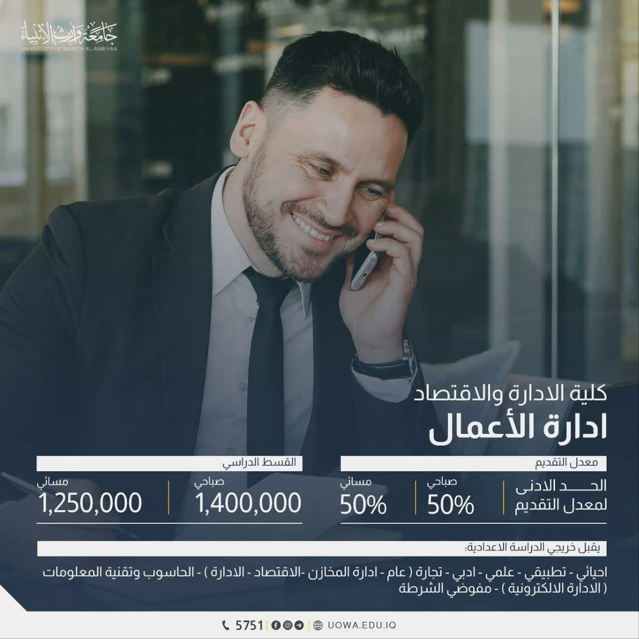 اكتشف مدخلات القبول والمعدلات المطلوبة لأقسام كليات الادارة والاقتصاد في جامعة وارث الانبياء (ع)