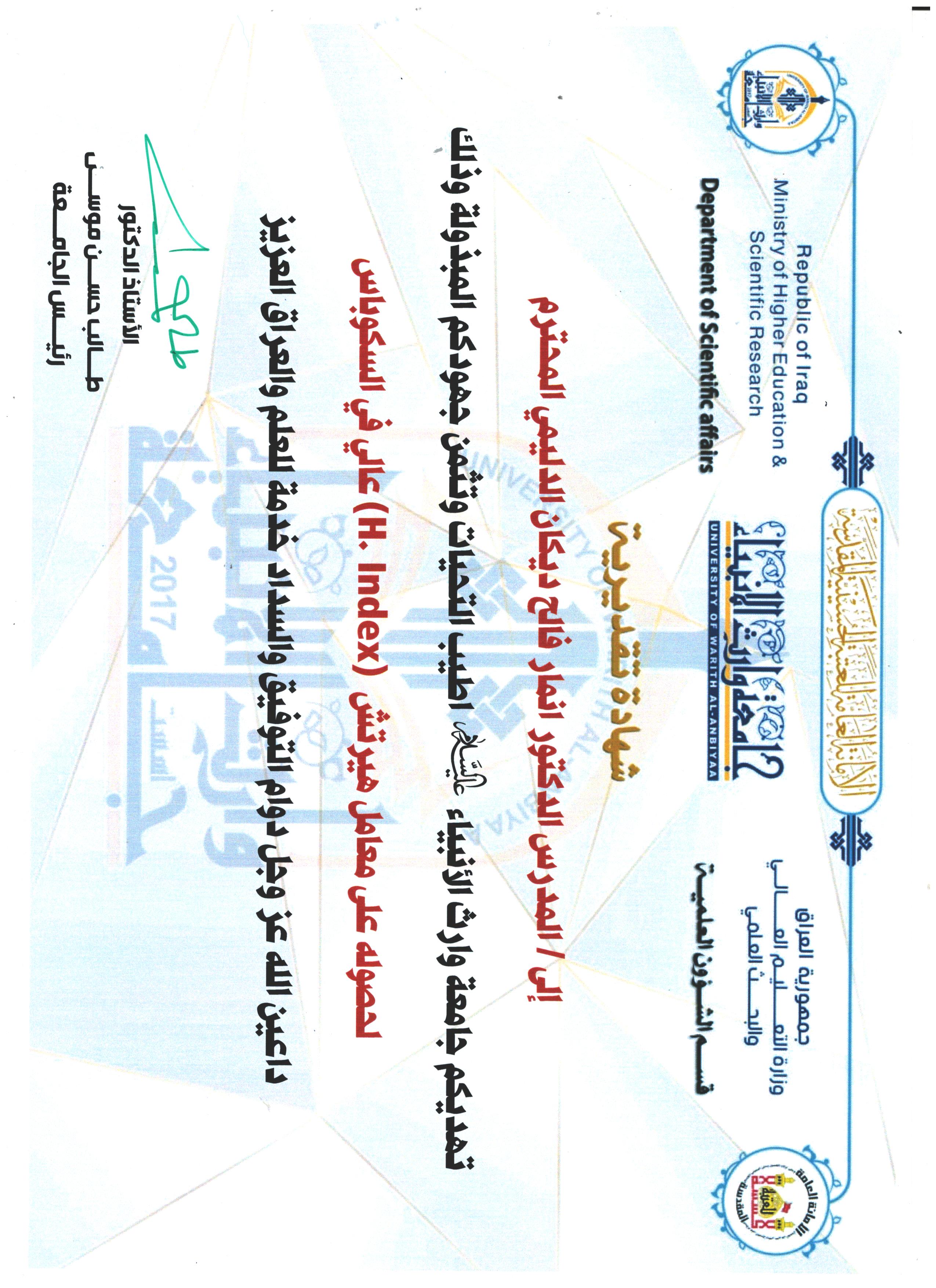 تتقدم جامعة وارث الأنبياء (ع) بالشكر و التقدير إلى أ.م.د. انمار فالح ديكان التدريسي في قسم الهندسة المدنية لجهوده المبذولة في المساهمة بإعلاء الصرح العلمي للجامعة و ذلك لنشر بحثه الموسوم (The Future of Eco - Friendly Cold Mix Asphalt) في مجلة Renewable and Sustainable Energy Reviews ضمن قاعدة بيانات Scopus.