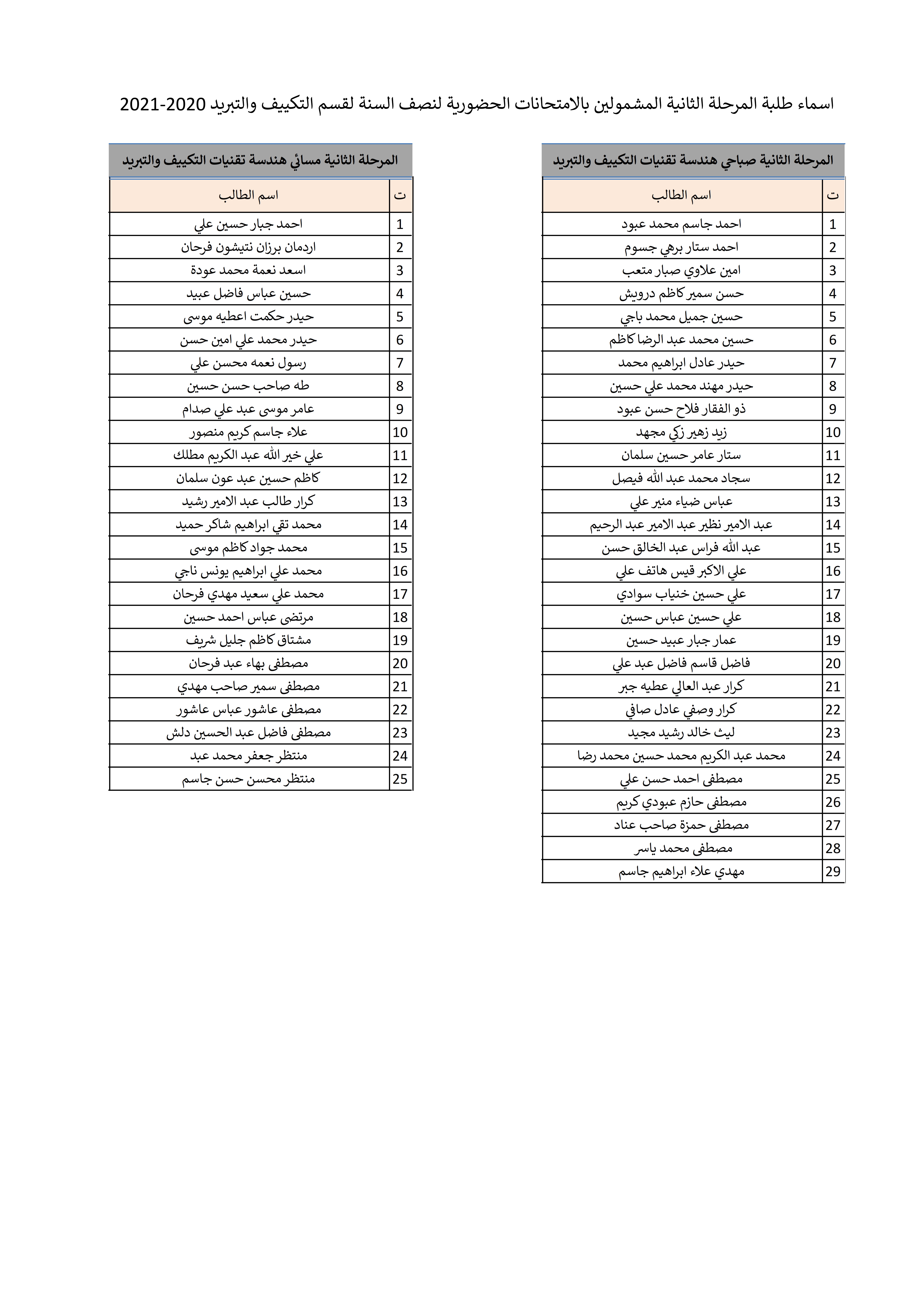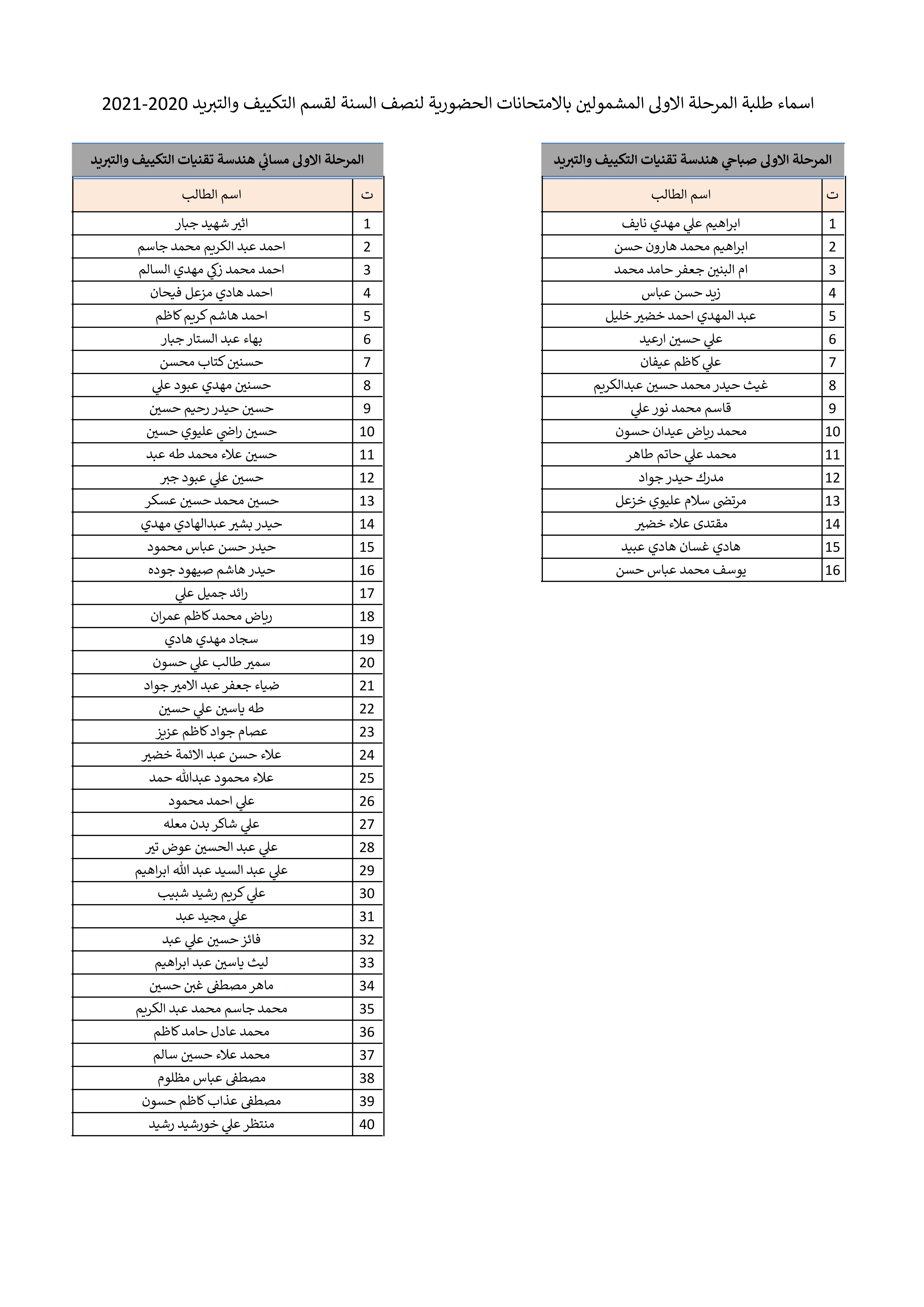 أدناه قوائم الأسماء الخاصة بالطلبة المشمولين بالامتحانات الحضورية لقسم هندسة تقنيات التكييف و التبريد.