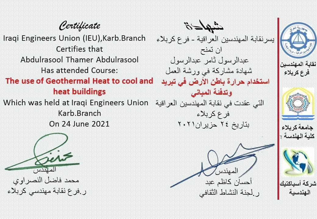 شارك قسم الهندسة المدنية متمثلاً بالتدريسي أ. م. د. احمد موسى عبد الهادي ومقرر القسم م. م. عبد الرسول قنديل في ورشة العمل الموسومة "استخدام حرارة باطن الأرض في تبريد و تدفئة المباني" والتي اقامتها نقابة المهندسين العراقية - فرع كربلاء بالتعاون مع كلية الهندسة في جامعة كربلاء وشركة آسباكتيك الهندسية.