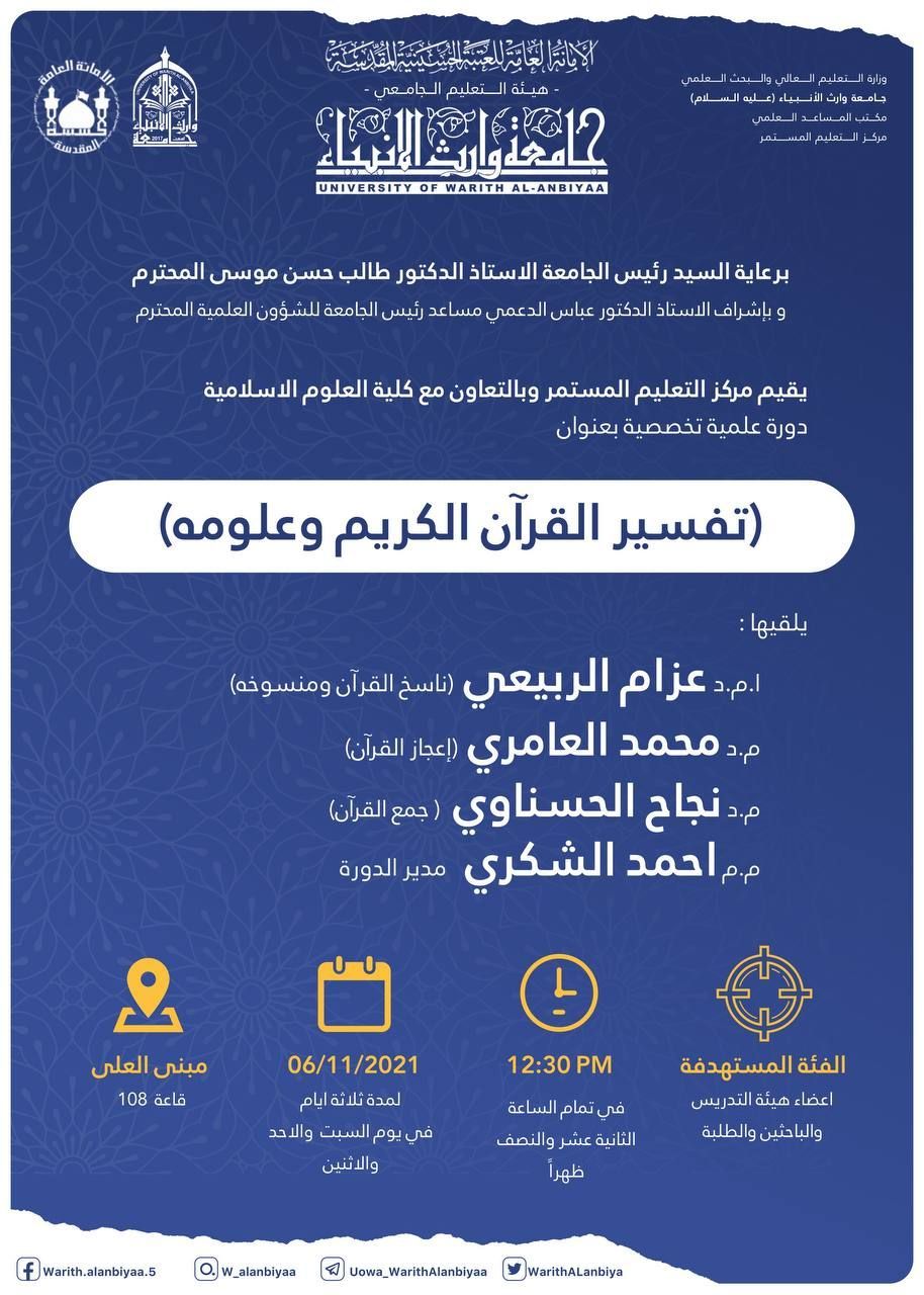 ختام الدورة العلمية الموسومة ب ( تفسير القرآن الكريم وعلومه) التي أقامها مركز التعليم المستمر في جامعة وارث الانبياء بالتعاون مع كلية العلوم الإسلامية