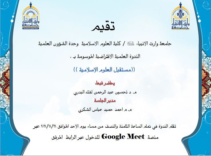 حلقة نقاشية بعنوان ( مستقبل العلوم الإسلامية) يلقيها ( الدكتور تحسين عبد الرحمن لفتة) وبادارة ( م. م احمد حميد عباس) وذلك في يوم الأحد الموافق ٢١ / ١١ / ٢٠٢١ في تمام الساعة الثامنة والنصف مساءً على منصة التعليم الإلكتروني الكوكل ميت