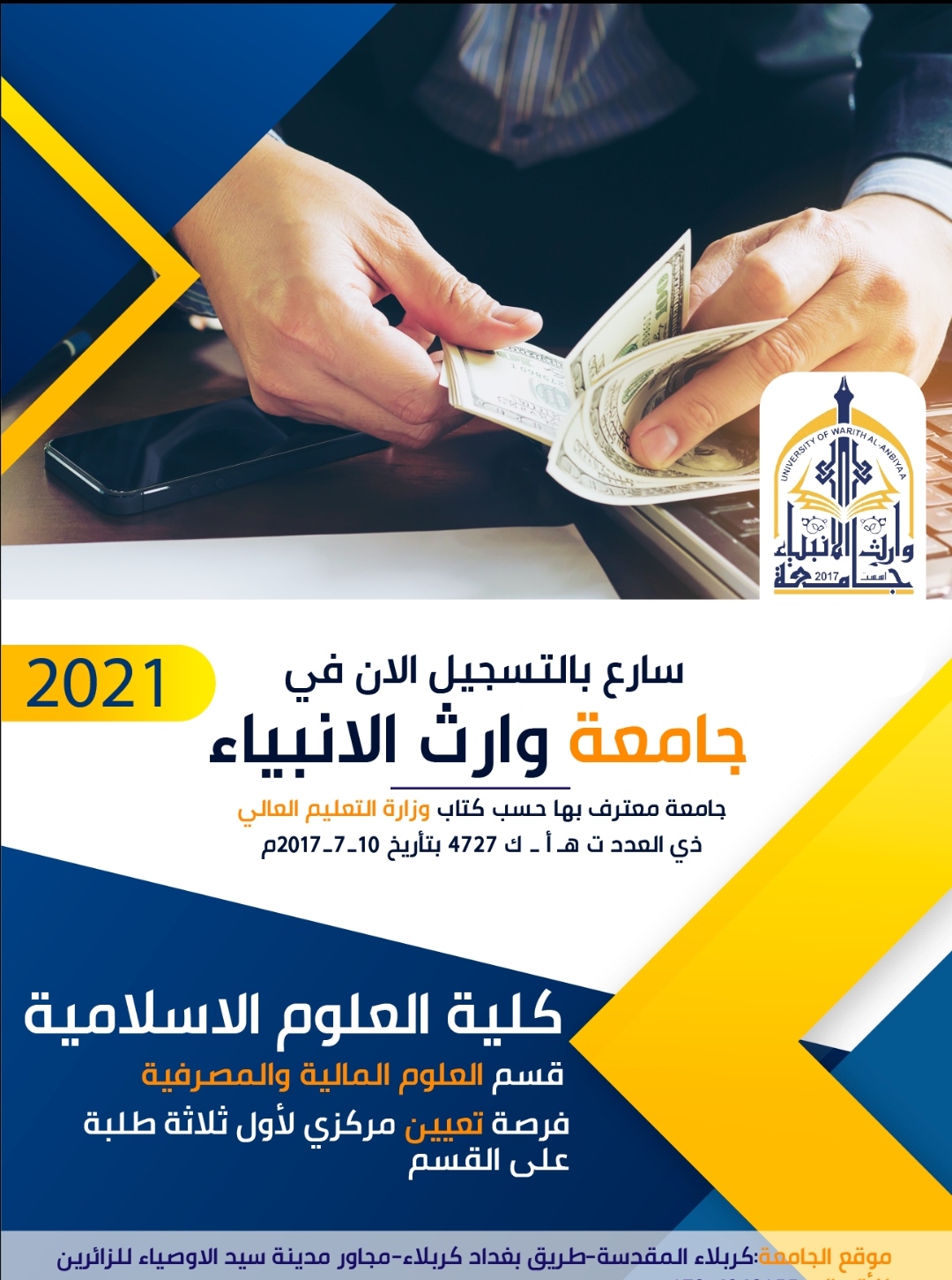 فرصة تعيين مركزي لاول ثلاثة طلبة على كل قسم من اقسام كلية العلوم الاسلامية في جامعة وارث الانبياء . تعلن كلية العلوم الاسلامية في جامعة وارث الانبياء التابعة للعتبة الحسينية المقدسة عن قرب فتح التقديم الى اقسامها الثلاثة : ● قسم علوم القران الكريم والتربية الاسلامية.● قسم الفقه واصوله ( مدرس وباحث اسلامي) ● قسم العلوم المالية والمصرفية الاسلامية ( محاسب في المصارف الحكومية والاهلية ) كما تعلن عن توفر تعيين مركزي للطلبة الثلاثة الاوائل على كل قسم في العتبة الحسينية المقدسة ...