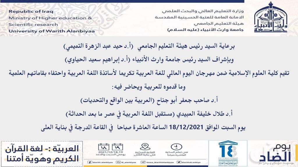 بمناسبة اليوم العالمي للغة العربية ،وبحضور السيد رئيس هيئة التعليم الجامعي الاستاذ الدكتور حيدر التميمي ،وبرعاية السيد رئيس الجامعة الاستاذ الدكتور ابراهيم الحياوي. اقامت جامعة وارث الانبياء(عليه السلام) ،وبالتعاون مع كليتي العلوم الإسلامية وكلية القانون مهرجانها الاولتحت عنوان( العربية:-لغة القرآن الكريم وهوية أمتنا) الذي يستمر لمدة يومين بحضور نوعي وكمي لأساتذة اللغة العربية والمهتمين بها والطلبة،حيث شهد المهرجان في يومه الاول ،طرح ورقتين بحثيتين لإثنين من كبار الباحثين في اللغة ،لبيان اهميتها ومفاصلها باعتبارها هوية امة من الواجب التمسك والاعتزاز بها.