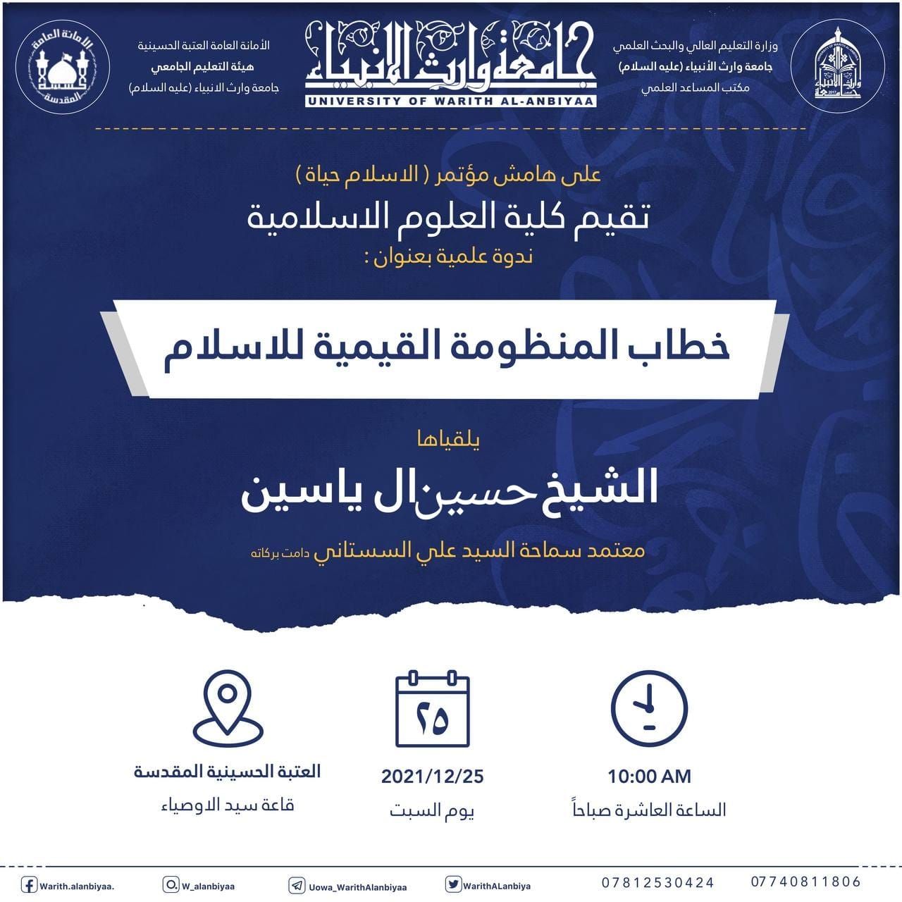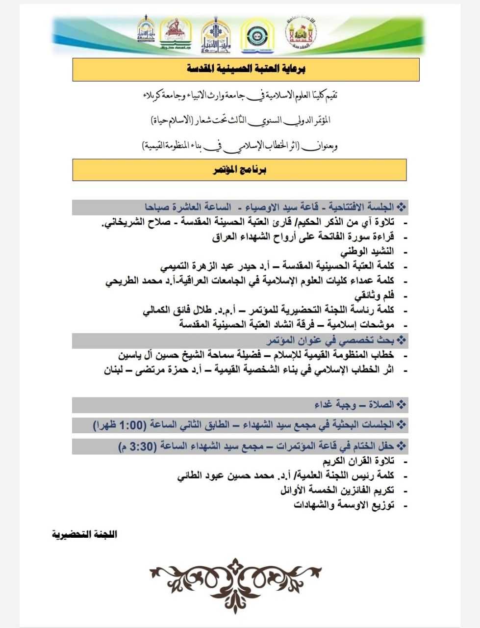 حرصا منها في ترسيخ المبادئ القيمية والأخلاقية التي أوصت بها الشريعة الإسلامية الغراء ولما لها من أثر طيب في بناء مجتمع صالح يزدهر بتراثه وثقافته الإسلامية لا سيما ترسيخ مبدأ الخطاب الإسلامي النابع من صميم الاسلام وتعاليمه رعت الأمانة العامة للعتبة الحسينية المقدسة المؤتمر الدولي السنوي الثالث والذي تقيمه كليتا العلوم الإسلامية في جامعة وارث الأنبياء وجامعة كربلاء تحت شعار الاسلام حياة وتحت عنوان اثر الخطاب الإسلامي في بناء المنظومة القيمية ووفق البرنامج المرفق والذي سيعقد في يوم السبت الموافق ٢٥/١٢/٢٠٢١