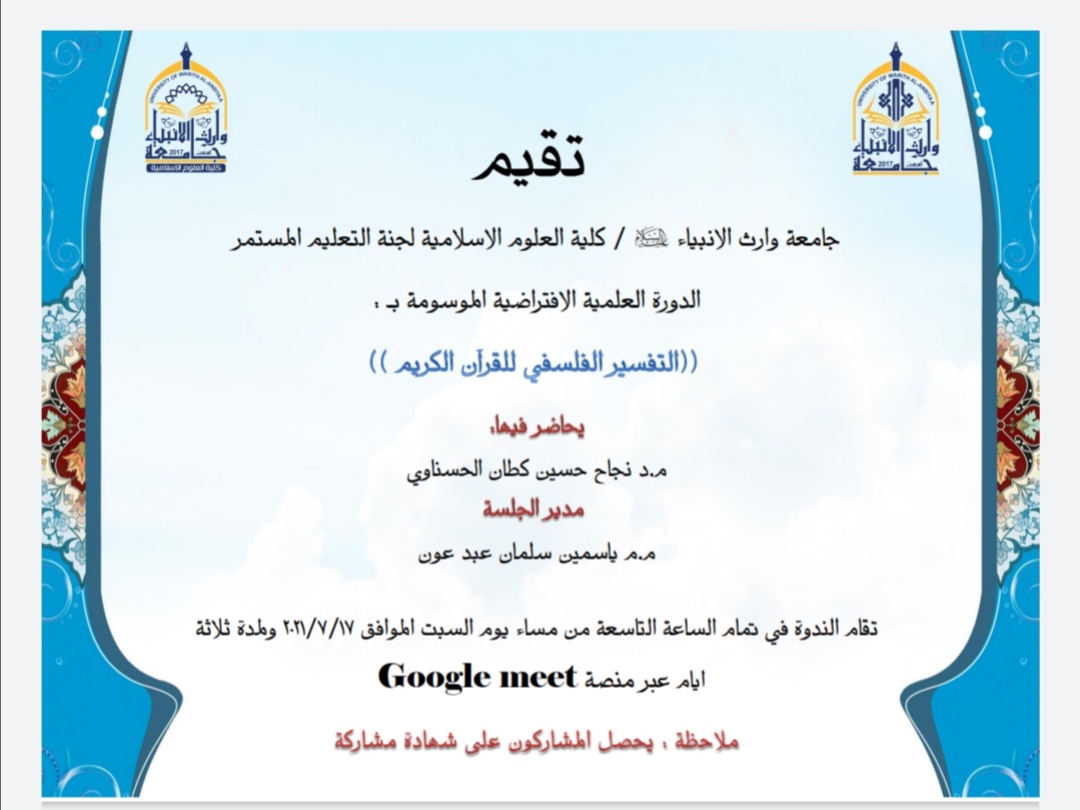 ندوة علمية بعنوان ( شبهات حول القرآن الكريم) يلقيها الدكتور نجاح حسين الحسناوي وبادارة م. م. ياسمين سلمان الطرفي في تمام الساعة الثامنة والنصف مساء من يوم السبت الموافق ٧ / ٨ /٢٠٢١ عبر منصة التعليم الإلكتروني الكوكل ميت