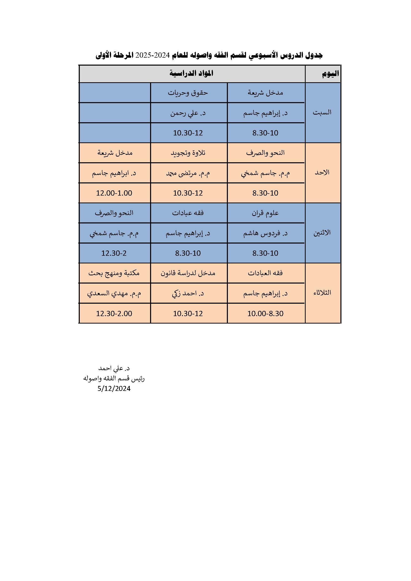 جدول الدروس الأسبوعي لقسم الفقه وأصوله