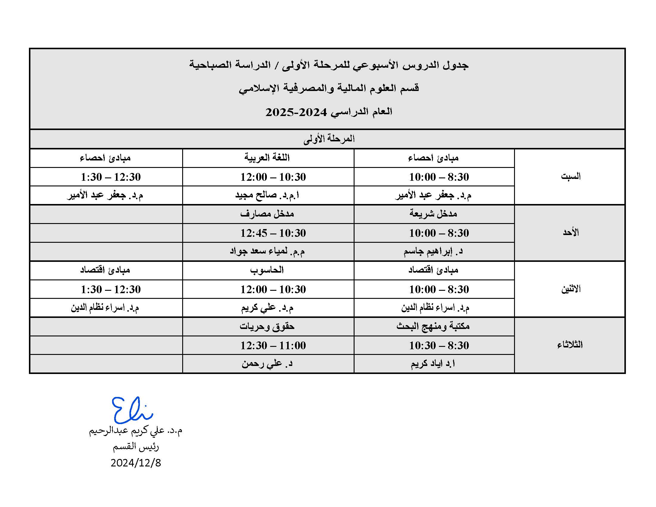 جدول المرحلة الاولى قسم العلوم المالية والمصرفية الاسلامي