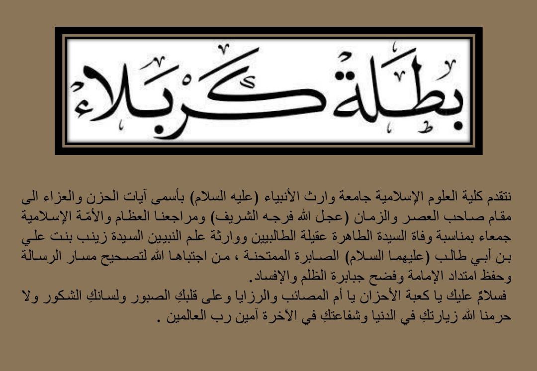 نتقدم كلية العلوم الإسلامية جامعة وارث الأنبياء (عليه السلام) بأسمى آيات الحزن والعزاء الى مقام صاحب العصر والزمان (عجل الله فرجه الشريف) ومراجعنا العظام والأمّة الإسلامية جمعاء بمناسبة وفاة السيدة الطاهرة عقيلة الطالبيين ووارثة علم النبيين السيدة زينب بنت علي بن أبي طالب (عليهما السلام) الصابرة الممتحنة ، من اجتباها الله لتصحيح مسار الرسالة وحفظ امتداد الإمامة وفضح جبابرة الظلم والإفساد.