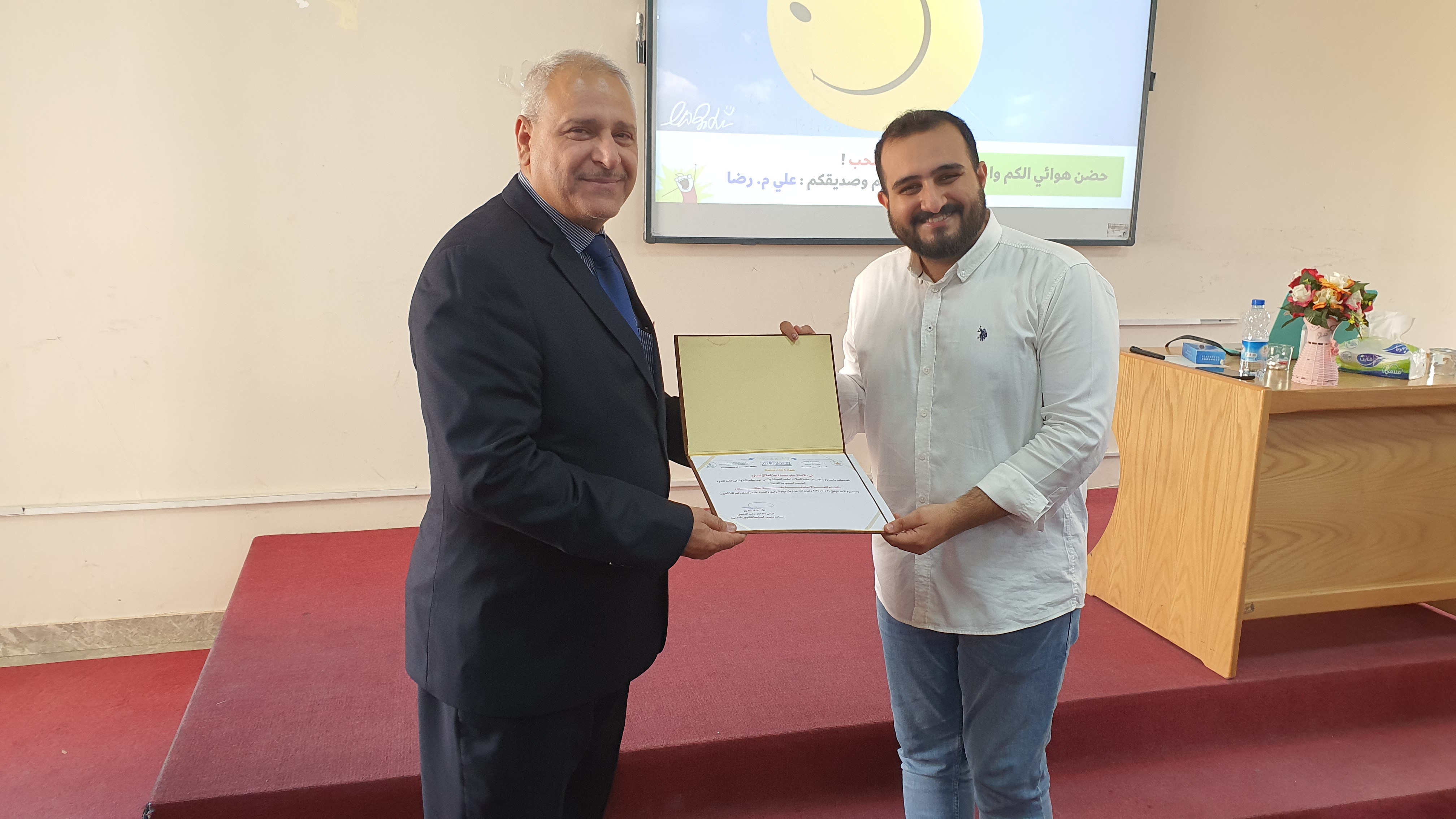 وفي نهاية الورشة تم تكريم الاستاذ علي محمد رضا على ما قدمه من معلومات قيمه باسلوب ممتع ،من قبل رئاسة جامعتنا متمثلة بالسيد عميد كلية القانون الاستاذ المساعد الدكتور عدنان جواد هاشم الشروفي  .