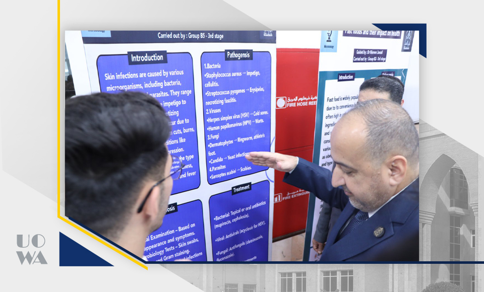 عرض الطلبة خلال الفعالية مجموعة متميزة من البوسترات العلمية التي تناولت موضوعات طبية وعلمية متنوعة، منها ما يتعلق بالكيمياء الحيوية، والوقاية والكشف المبكر عن الأمراض المزمنة مثل داء السكري، وغيرها من المواضيع الطبية المهمة، بإشراف أساتذة الكلية ومتابعتهم.