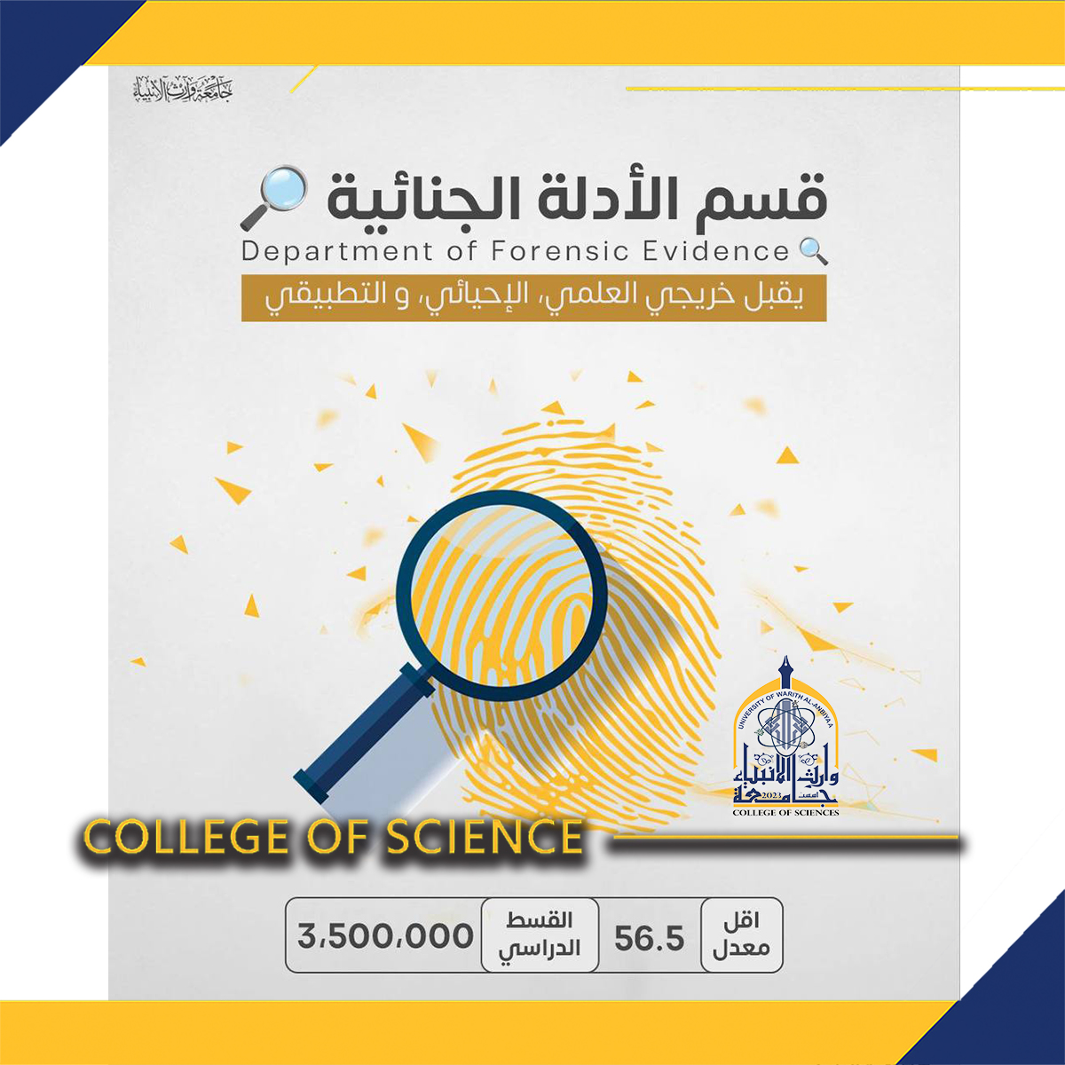 تعرف على مدخلات القبول والمعدلات المطلوبة بكلية العلوم(#قسم_الادلة_الجنائية)في جامعة وارث الأنبياء (عليه السلام)، وابدأ رحلتك الأكاديمية نحو الإبداع والتميّز