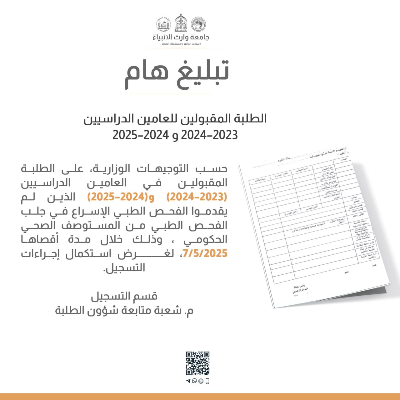 حسب التوجيهات الوزارية، على الطلبة المقبولين في العامين الدراسيين (2023–2024) و(2024–2025) الذين لم يقدموا الفحص الطبيالإسراع في جلب الفحص الطبي من المستوصف الصحي الحكومي ، وذلك خلال مدة أقصاها 2025/5/7، لغرض استكمال إجراءات التسجيل.