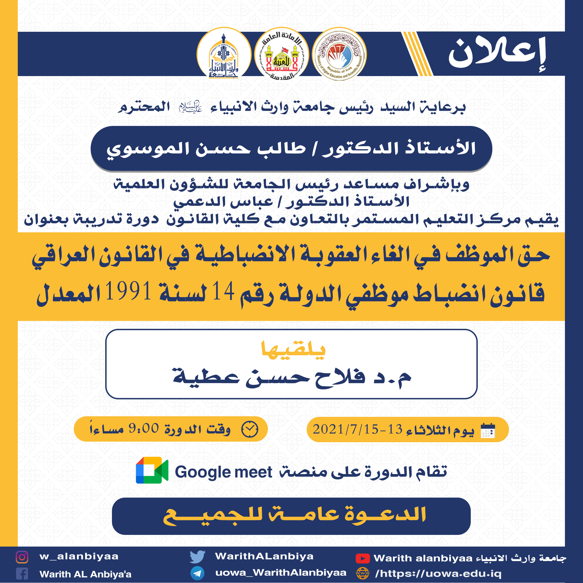 اعلان / دورة بعنوان(الادارة الالكترونية الخاصة بطلبة جامعة وارث الانبياء (عليه السلام))