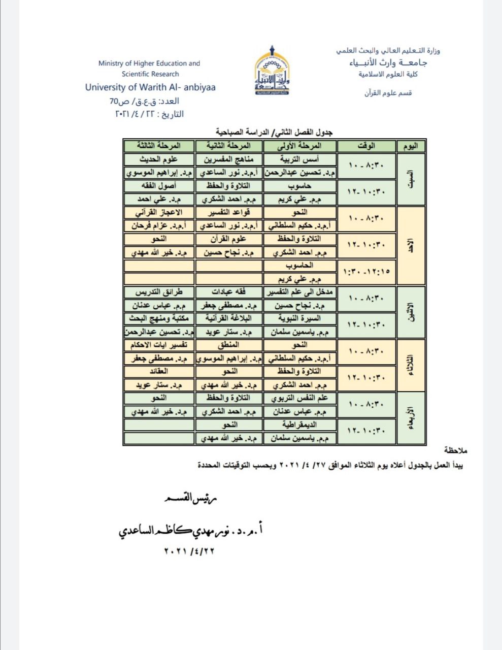 جدول الدروس الأسبوعي لقسم علوم القرآن / للمراحل الثلاث / الدراسة الصباحية