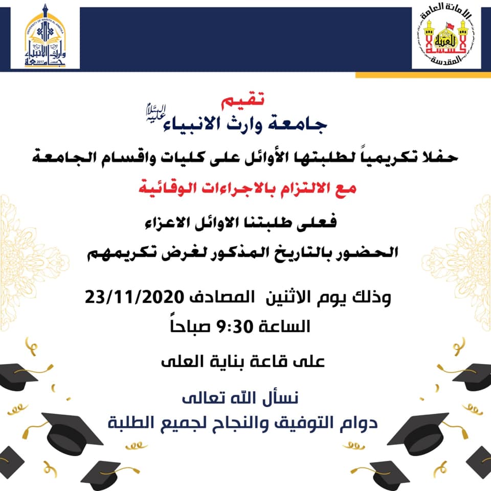 تثميناً للجهود القيمة المبذولة من قبل طلبتها الاعزاء لتحقيق المراكز الاولى في الامتحانات النهائية ، أقامت جامعة وارث الانبياء(عليه السلام) حفلاً بهيجاً احتفاءً وتكريماً للطلبة الاوائل مع الالتزام بالضوابط الصحية وبحضور السيد معاون الامين العام ورئيس قسم التعليم العالي في العتبة الحسينية المقدسة الدكتور افضل الشامي والسيد رئيس الجامعة الأستاذ الدكتور طالب حسن موسى والسادة المساعدين وعمداء الكليات واعضاء هيئة التدريس .حيث القيت كلمات لبعض السادة الحضور عبروا عن مباركتهم وتهنئتهم للطلبة المتفوقين ، بينما تحدث السيد رئيس الجامعة أ.د طالب الموسوي في كلمته قائلاً :اقامت الجامعة هذه الاحتفالية الخاصة لتثمين تفوق الطلبة الاوائل الأعزاء وتكريماً لجهودهم وحافزاً لأقرانهم وزملائهم بان يجدّوا في تحصيل العلم .واضاف الموسوي : الاحتفال كان مناسبة طيبة وتم بحضور ذوي الطلبة المتفوقين ، حيث لمسنا منهم الفخر والاعتزاز بتكريم الجامعة لأولادهم ، ونسأل الله عز وجل ان يزول هذا الوباء ويعود الطلاب الى مقاعد الدراسة وتعود الناس الى حياتهم الطبيعية انه سميع مجيب.