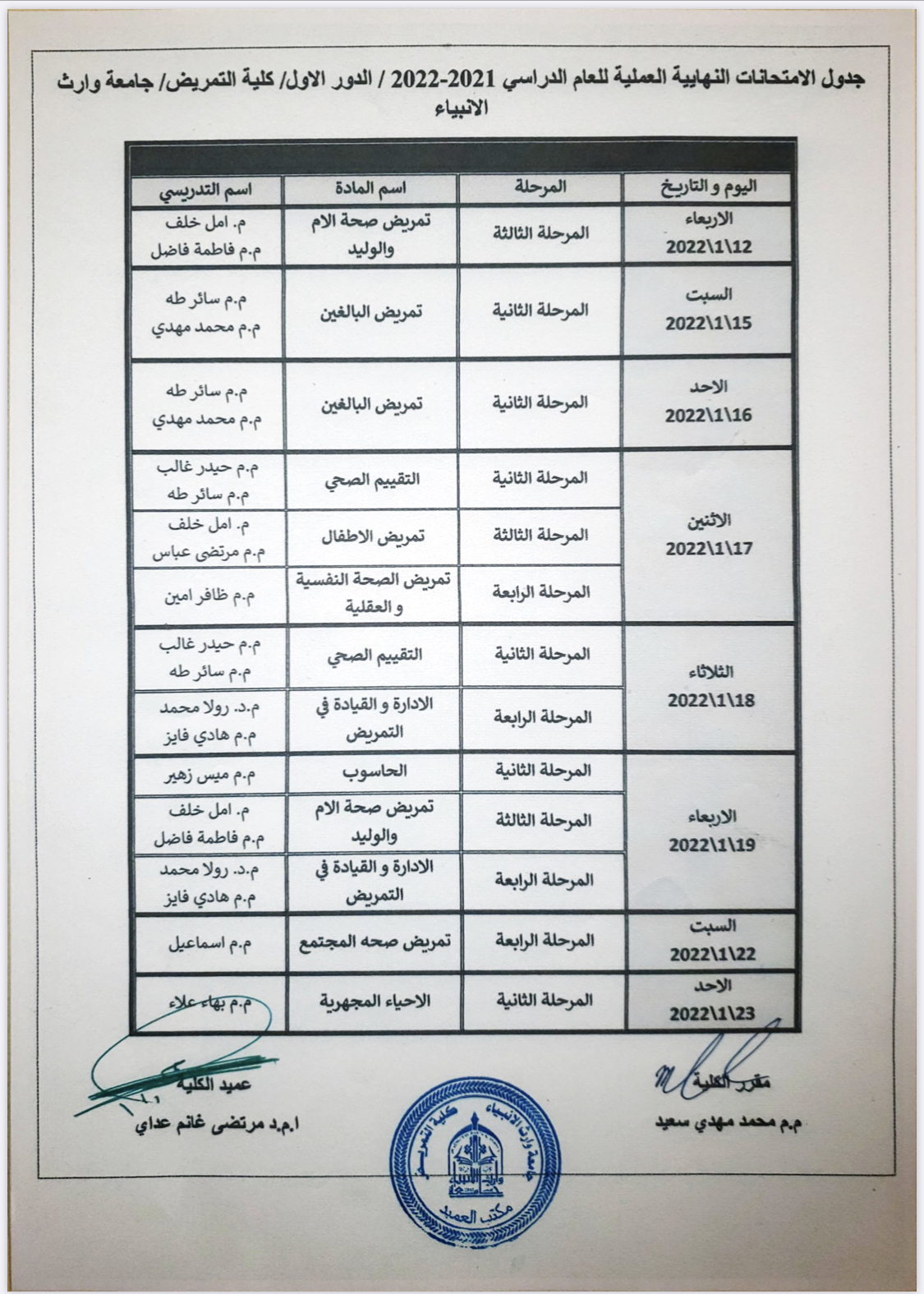 تمت مصادقة عمادة كلية التمريض على جدول الامتحانات العملية النهائية للمراحل ( الثانية و الثالثة و الرابعة ) للفصل الدراسي الثاني للعام الدراسي 2021/2022