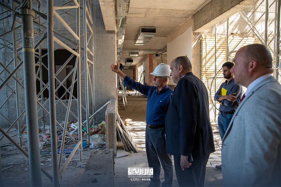 تفقد السيد رئيس الجامعة الأستاذ الدكتور إبراهيم سعيد الحياوي، مبنى الأقسام الداخلية للطالبات برفقة عدد من مهندسي الشركة المنفذة. تأتي هذه الجولة للاطلاع على تقدم الأعمال والإنجازات التي وصلت إلى مراحل متقدمة، حيث تسعى الجامعة إلى إنشاء مبانٍ جديدة تكفي لاستيعاب أعداد الطالبات المتزايدة.