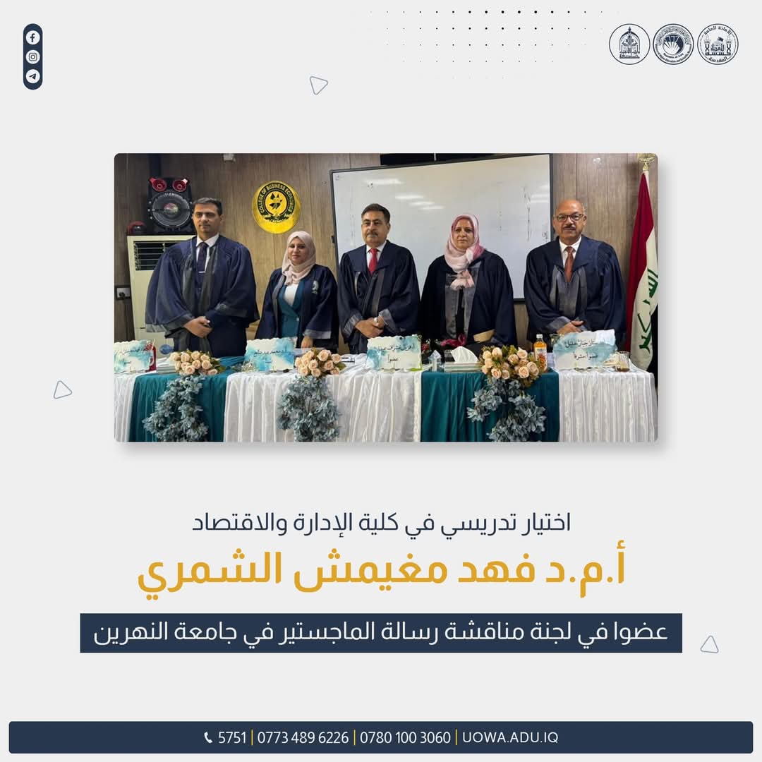 Assistant Professor Dr. Fahd Mughaymish Al-Shammari, Assistant Dean of the College of Administration and Economics, was selected as a member to discuss a Master's thesis for one of the graduate students at Al-Nahrain University, College of Business Economics, Department of Banking Management Economics.