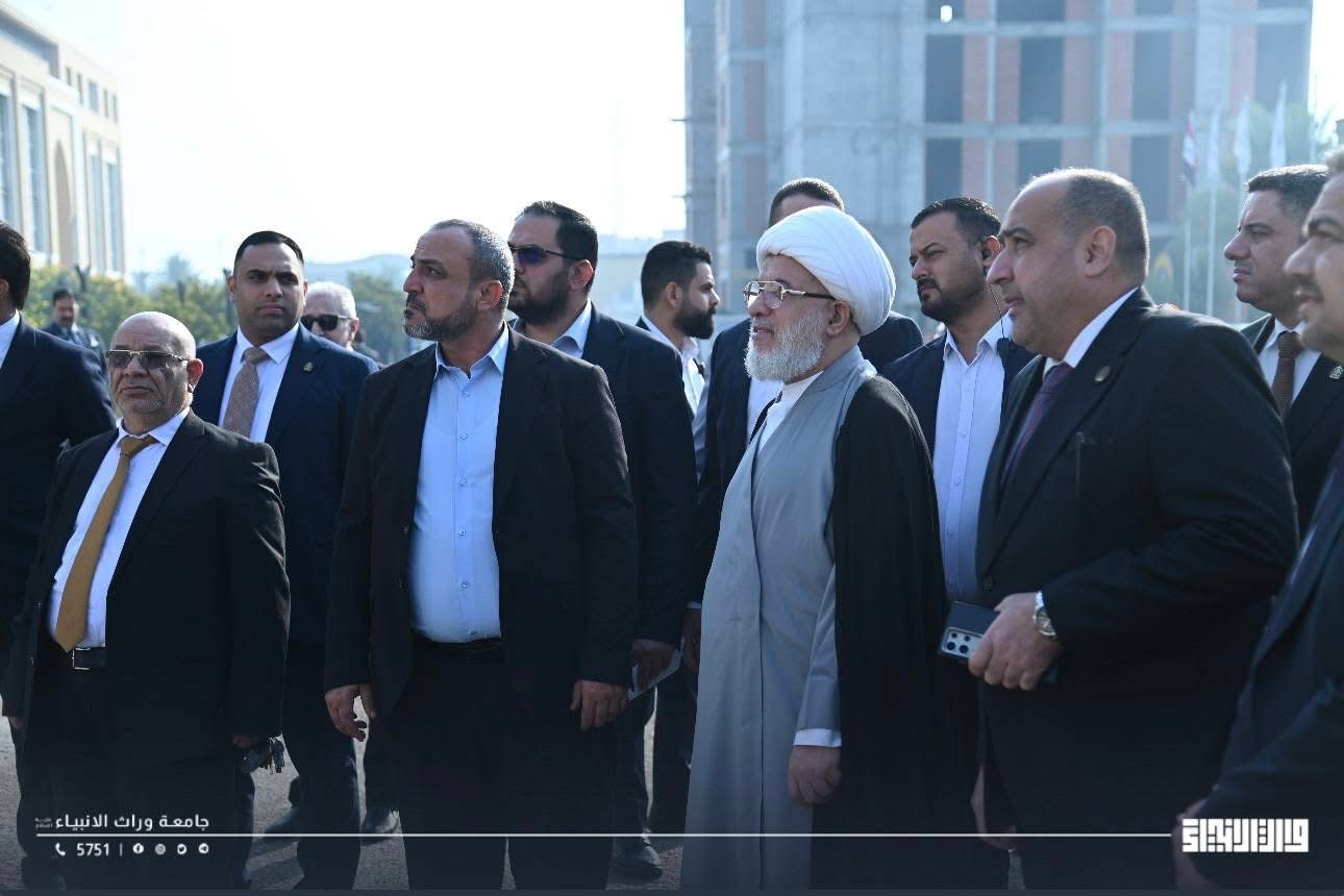His Eminence Sheikh Abdul Mahdi Al-Karbalai, visited Warith Al-Anbiyaa University today. He was received by the University President, Professor Dr. Ibrahim Saeed Al-Hayawi, to conduct an inspection tour and review the ongoing expansion and development projects within the university.