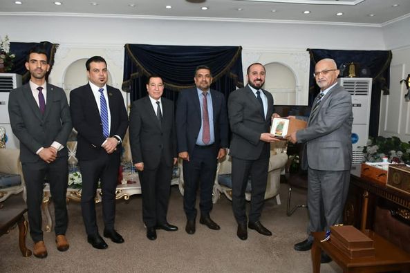 The President of the University of Technology, Professor Dr. Ahmed Muhammad Hassan Al-Ghabban, received in his office a high-level delegation from the University of Heir al-Anbiya affiliated with the Holy Shrine of Hussein, headed by Professor Dr. Nofal Al-Araji, Assistant to the University President for Administrative Affairs.Dr. Hussein Hadi Hussein, Dean of the College of Engineering, and Dr. Ali Sahib Al-Sharifi, Dean of the College of Law, and from the University of Technology. The meeting was attended by the Assistant to the University President for Administrative Affairs, Professor Dr. Hussein Hamid Karim, and the Director of the Department of Media and Public Relations, Dr. Sari Tahseen Rayshan.