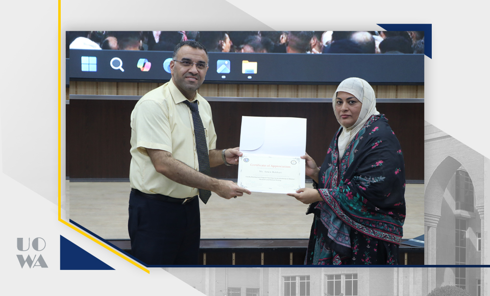 In an atmosphere of appreciation and recognition, the Dean of the College of Medicine, Professor Ali Abdul Saadoun al-Ghazi, honored the lecturers in recognition of their scientific efforts and active contributions to the success of this workshop.