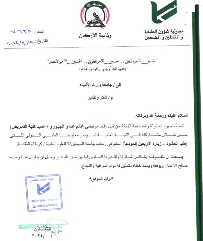 Participation of the Dean of the College of Nursing, Prof. Dr. (Mortada Ghanem Adai Al-Jabouri) in the Scientific Committee of the Second International Scientific Conference of the Assistant for Medical Affairs, Fighters and Sacrifices (Crowd Medicine - Arbaeen Pilgrimage as a Model) held at Al-Sabtain University for Medical Sciences / Karbala