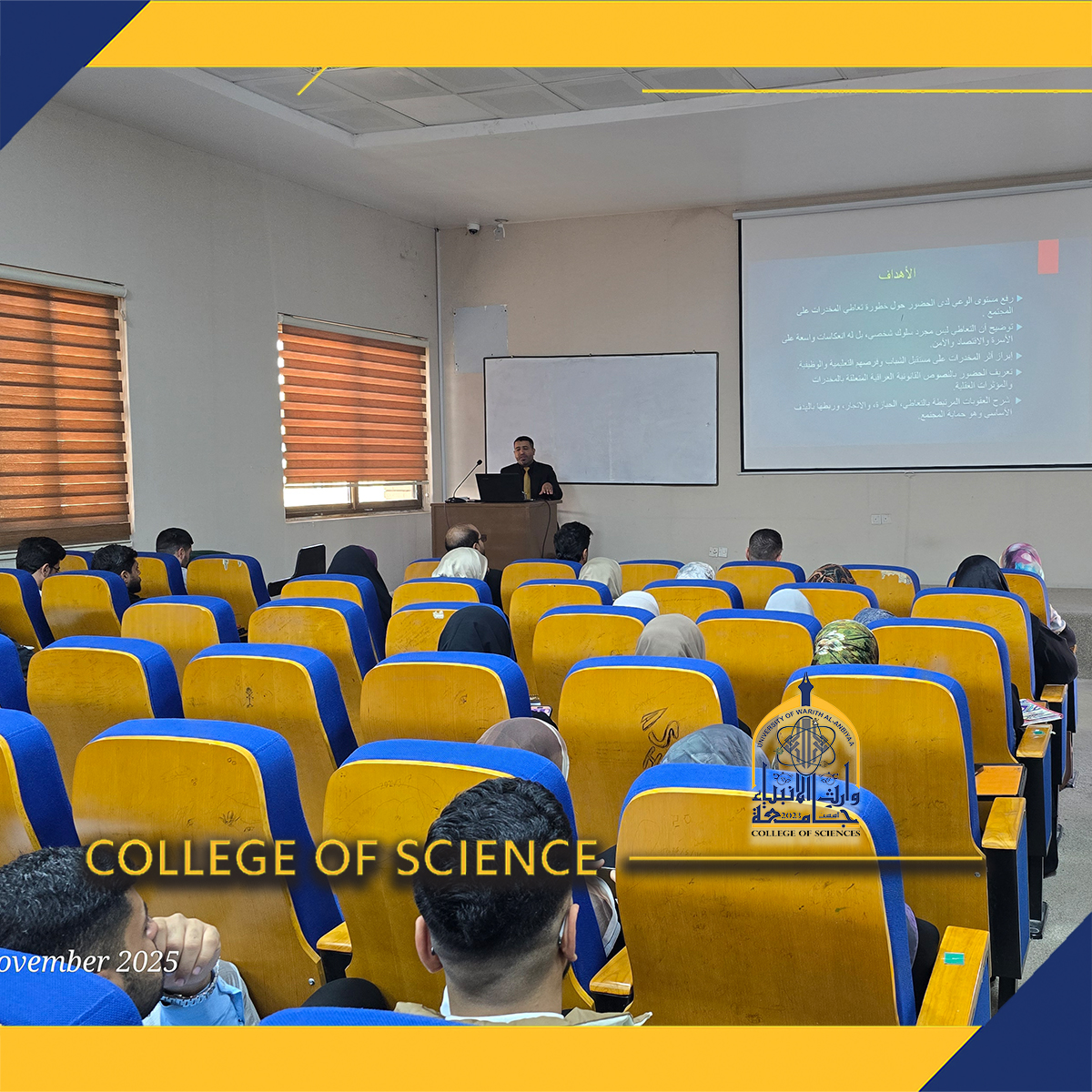 The College of Science at the University of Warith Al-Anbiyaa (peace be upon him) organized an awareness workshop entitled The Impact of Drug Abuse on Society, presented by faculty member Assistant Lecturer Abbas Taher, with the participation of students and academic staff.